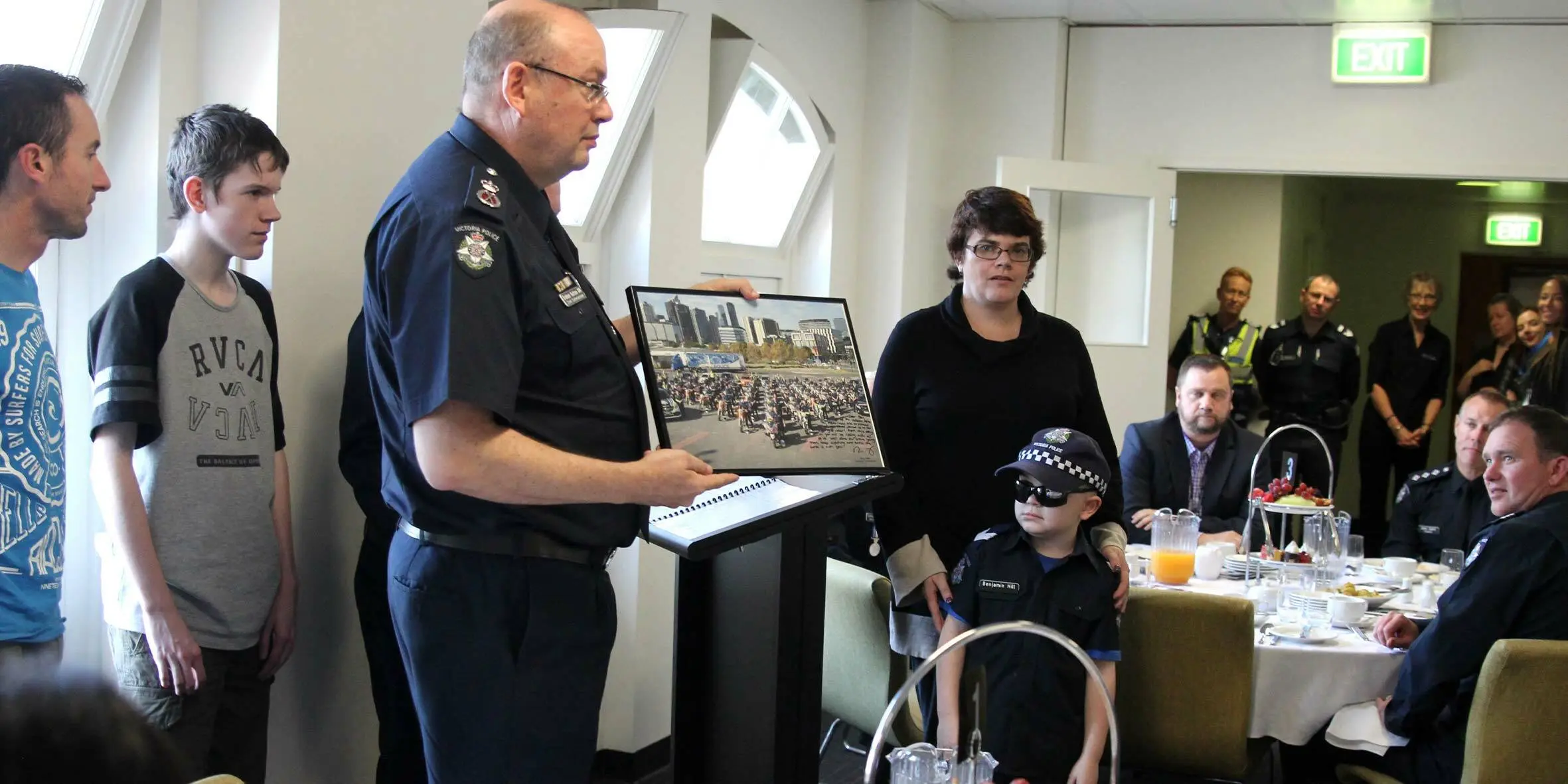 Benjamin was officially sworn in as a police motor trike officer. He had a group photo taken with all the police at the academy and was served fish and chips in the police café by Chief Commissioner Graeme Ashton.