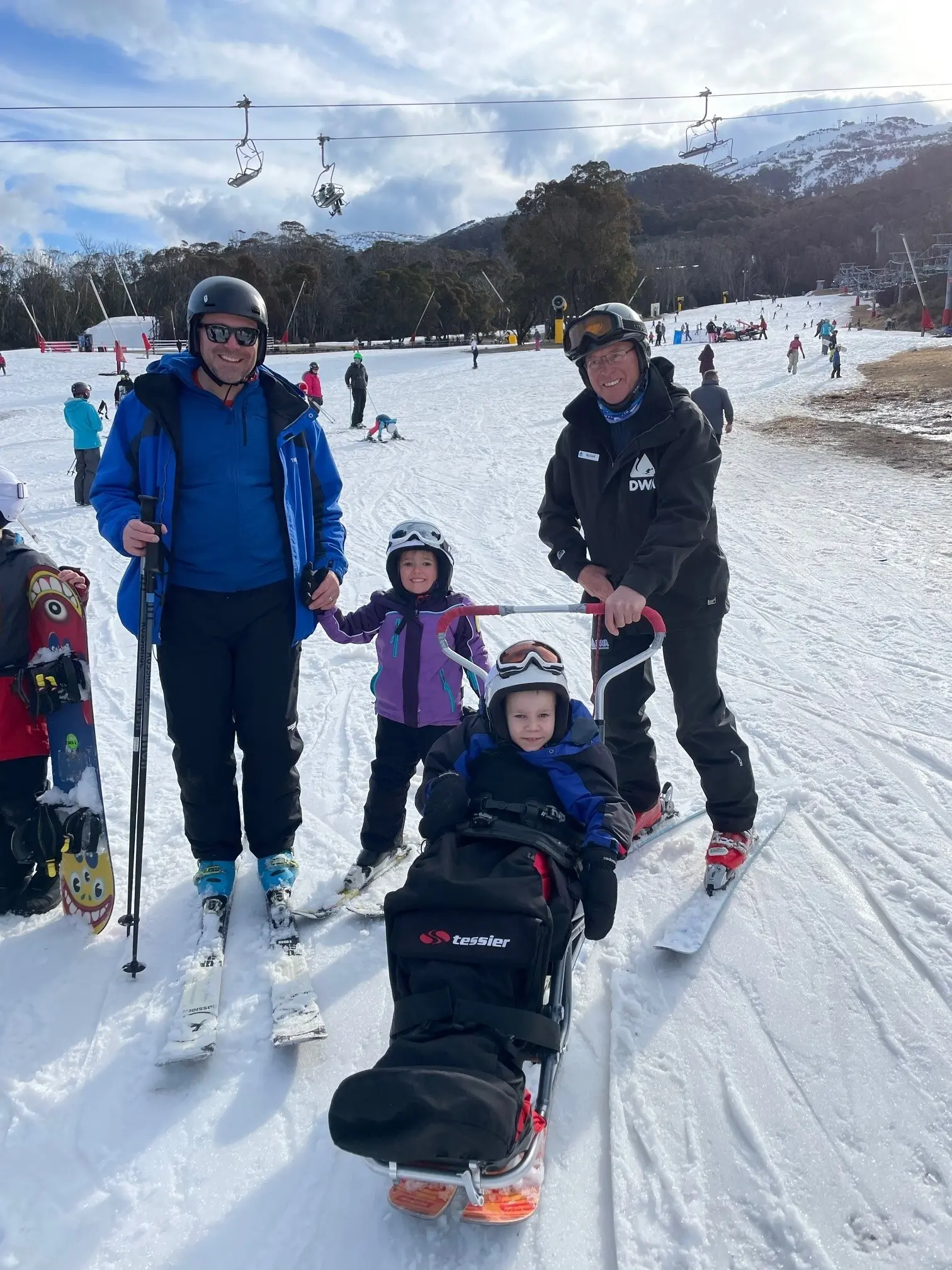 With the support of the Disabled Winter Sport Association, Super Cooper was fitted with his own special sit ski so he could slide down the slopes with his family. Cooper even had his own personal volunteer who helped to get him up and down the mountain each day.