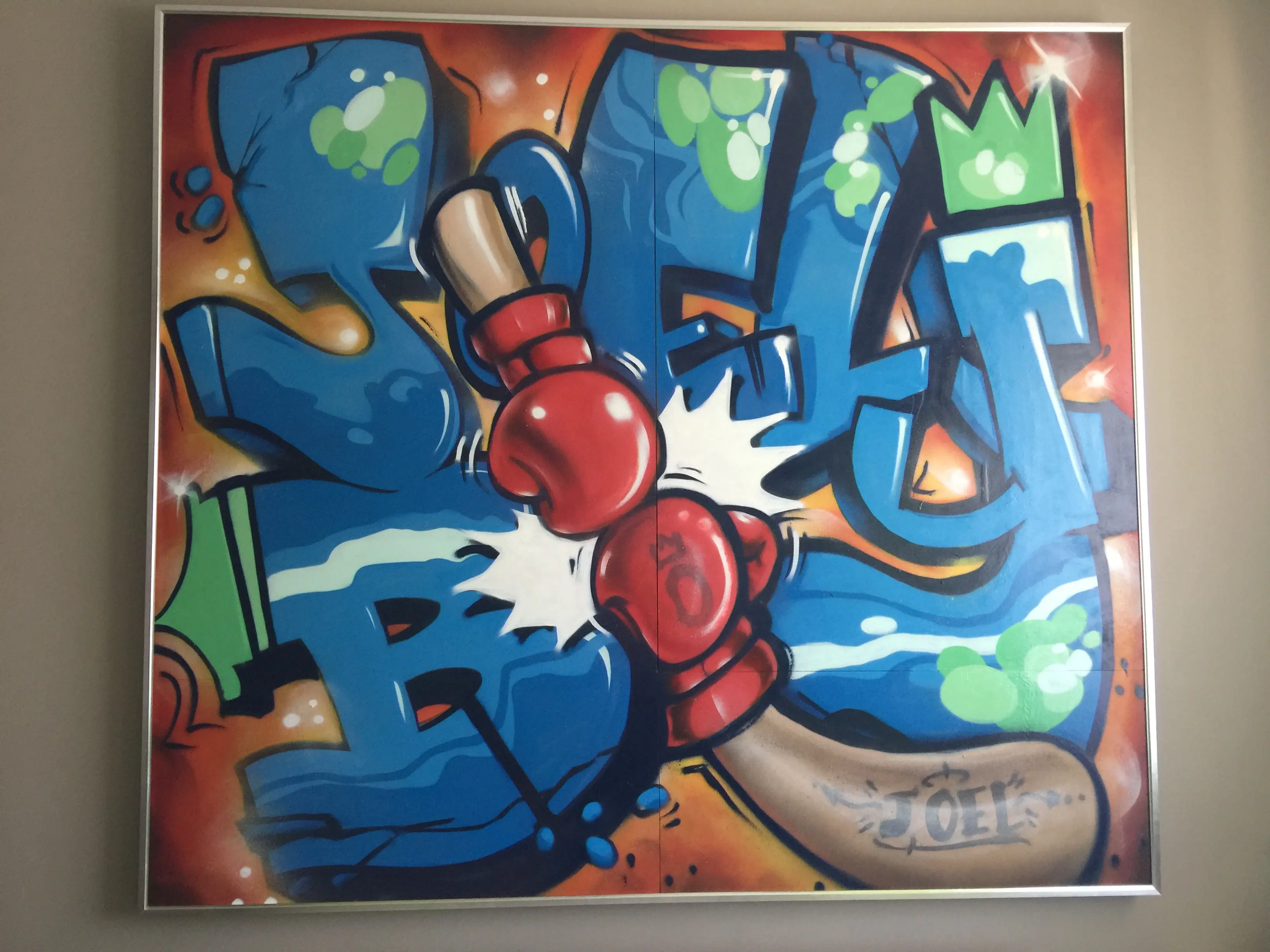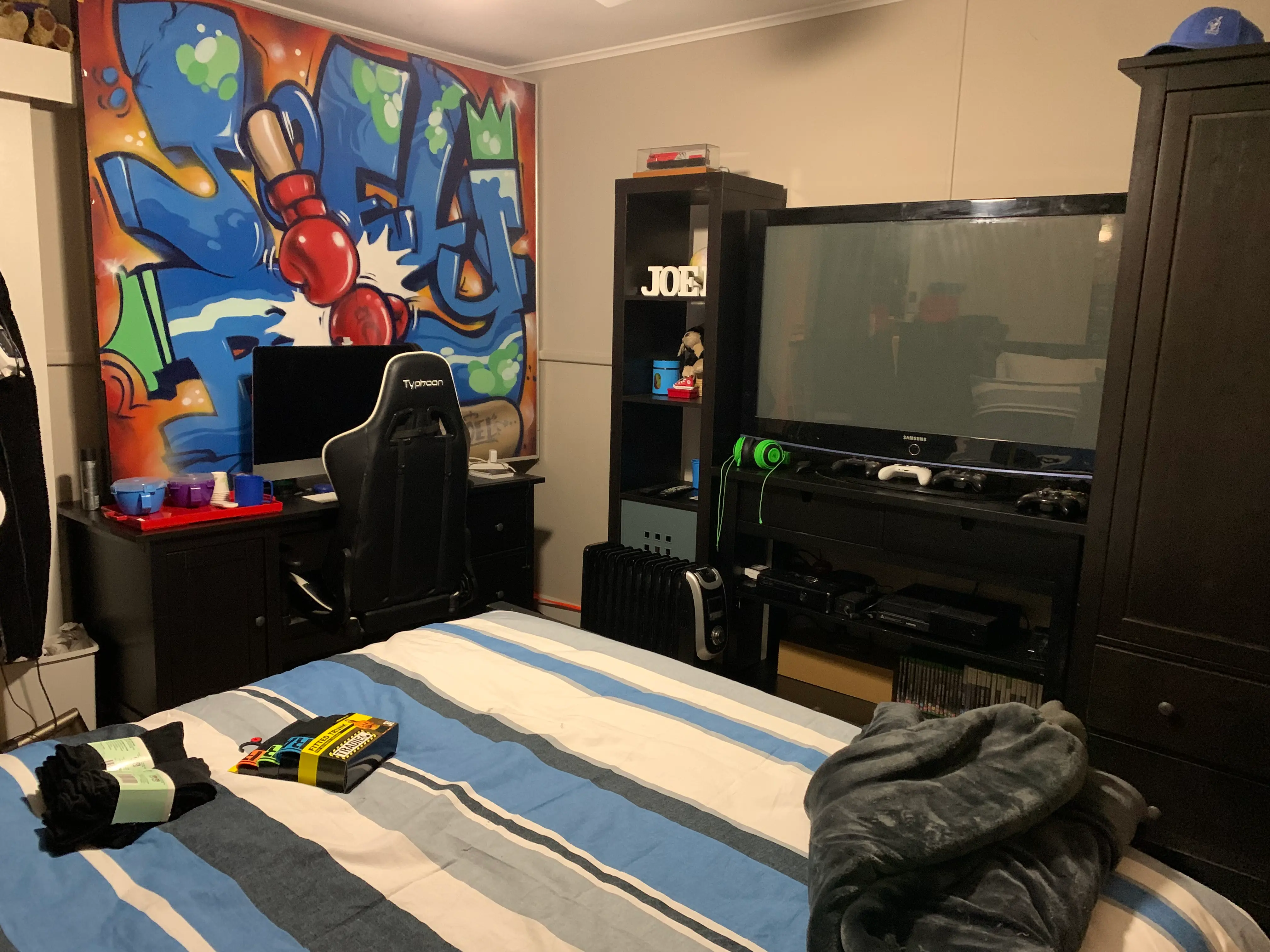 “Joel also got a really lovely white quilt cover with an Aztec design from Adairs, and the massive graffiti painting which says ‘Joel Boy’ and is two gloves punching.”